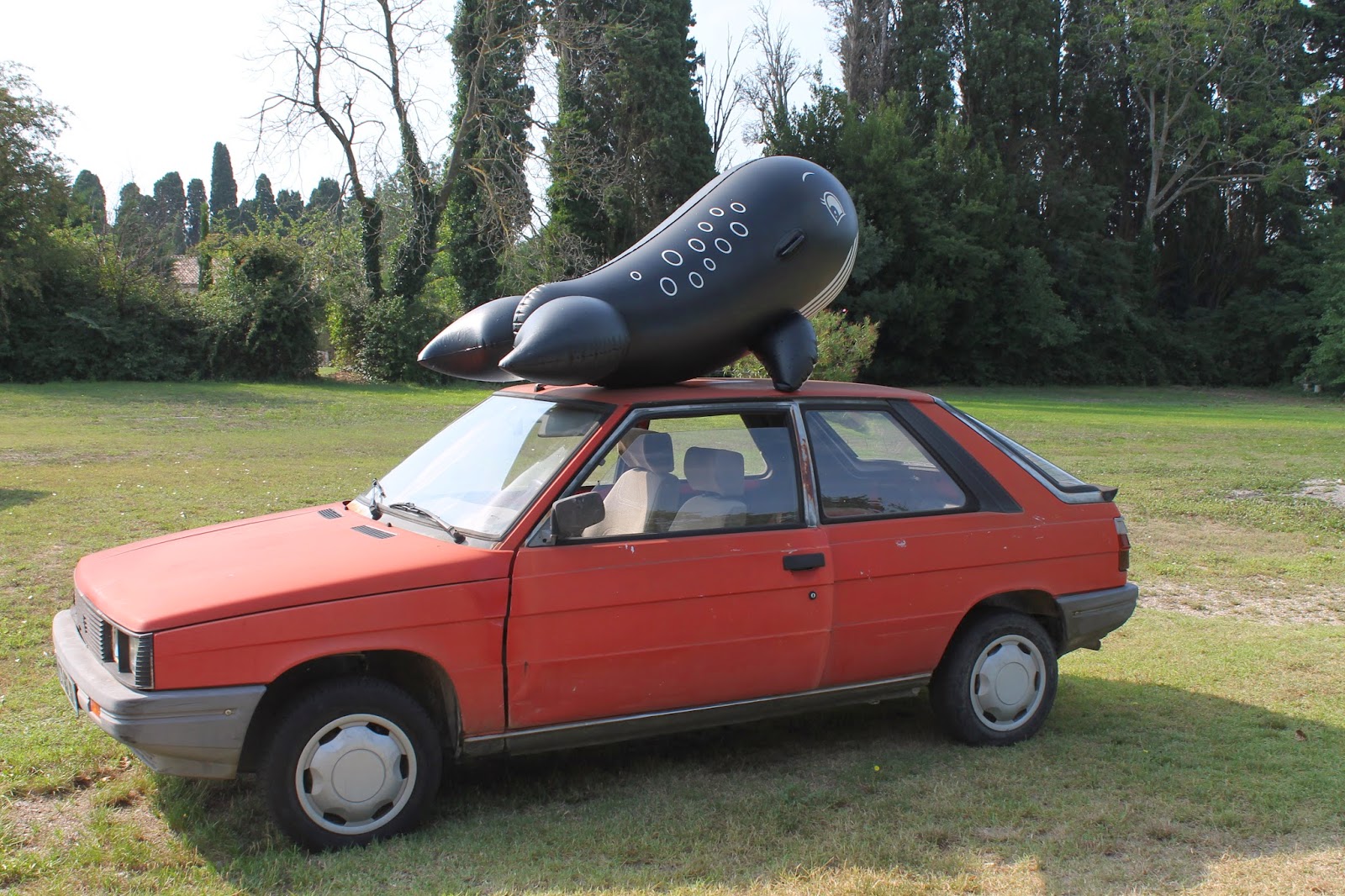 La voiture de collection de mamie et l’orque gonflable de la piscine |