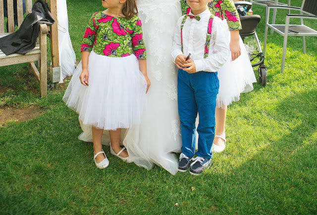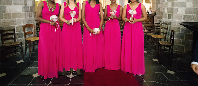 Le panier en osier a été customisé par ma belle-mère, d’après l’idée des décorations de paniers à dragées que les gens font couramment au Gabon et que j’ai donc souvent vues dans les mariages. Toujours avec le tissu qui était le fil conducteur de la décoration, avec le vert et le rose.