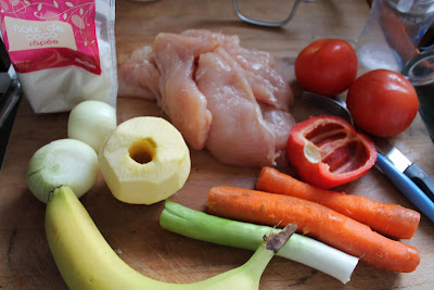 Faire chauffer l,’huile dans une sauteuse anti adhésive avec gingembre, curcuma et ail. Faire revenir les morceaux de poulet. Ajouter le hachis de légumes, le poivron et un demi verre d’eau. Saupoudrer avec la noix de coco, le curry, saler et poivrer.