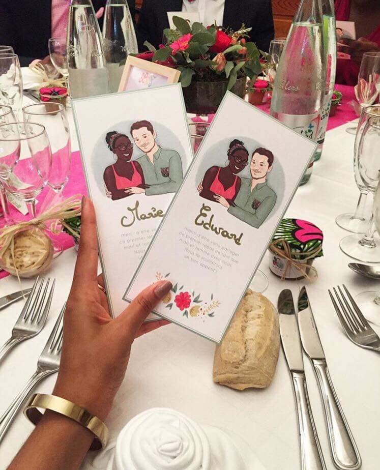 Le panier en osier a été customisé par ma belle-mère, d’après l’idée des décorations de paniers à dragées que les gens font couramment au Gabon et que j’ai donc souvent vues dans les mariages. Toujours avec le tissu qui était le fil conducteur de la décoration, avec le vert et le rose.