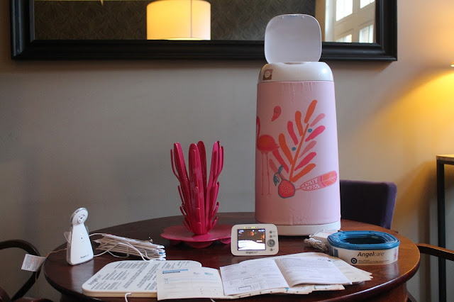 Mais il y avait aussi l’écoute-bébé avec caméra infrarouge et capteur de mouvement à placer sous le matelas de bébé, l’anneau de bain, le pot 3 hauteurs, le transat de bains et l’égouttoir. J’ai vraiment bien aimé les jolis coloris!