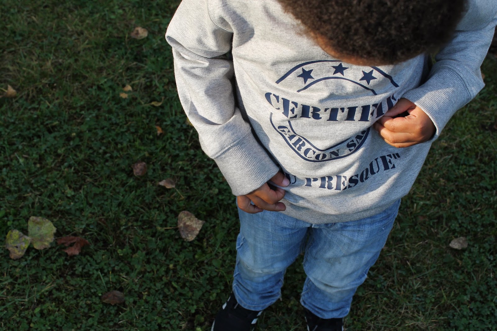 J’avoue que j’ai mis du temps à me décider parce que j’avais craqué sur plusieurs designs mais j’ai fini par faire personnaliser un sweat molleton gris chiné pour mon fils. Devant le tampon « Certifié garçon sage » avec la précision « Ou presque », derrière son prénom et les coudières ovales.