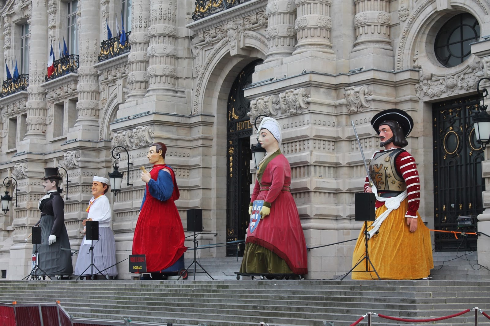Pierre de Roubaix en rouge était en bonne place devant l’entrée de l’hôtel de ville, accompagnés des autres géants, pour regarder le défilé de fanfares et de déguisements.