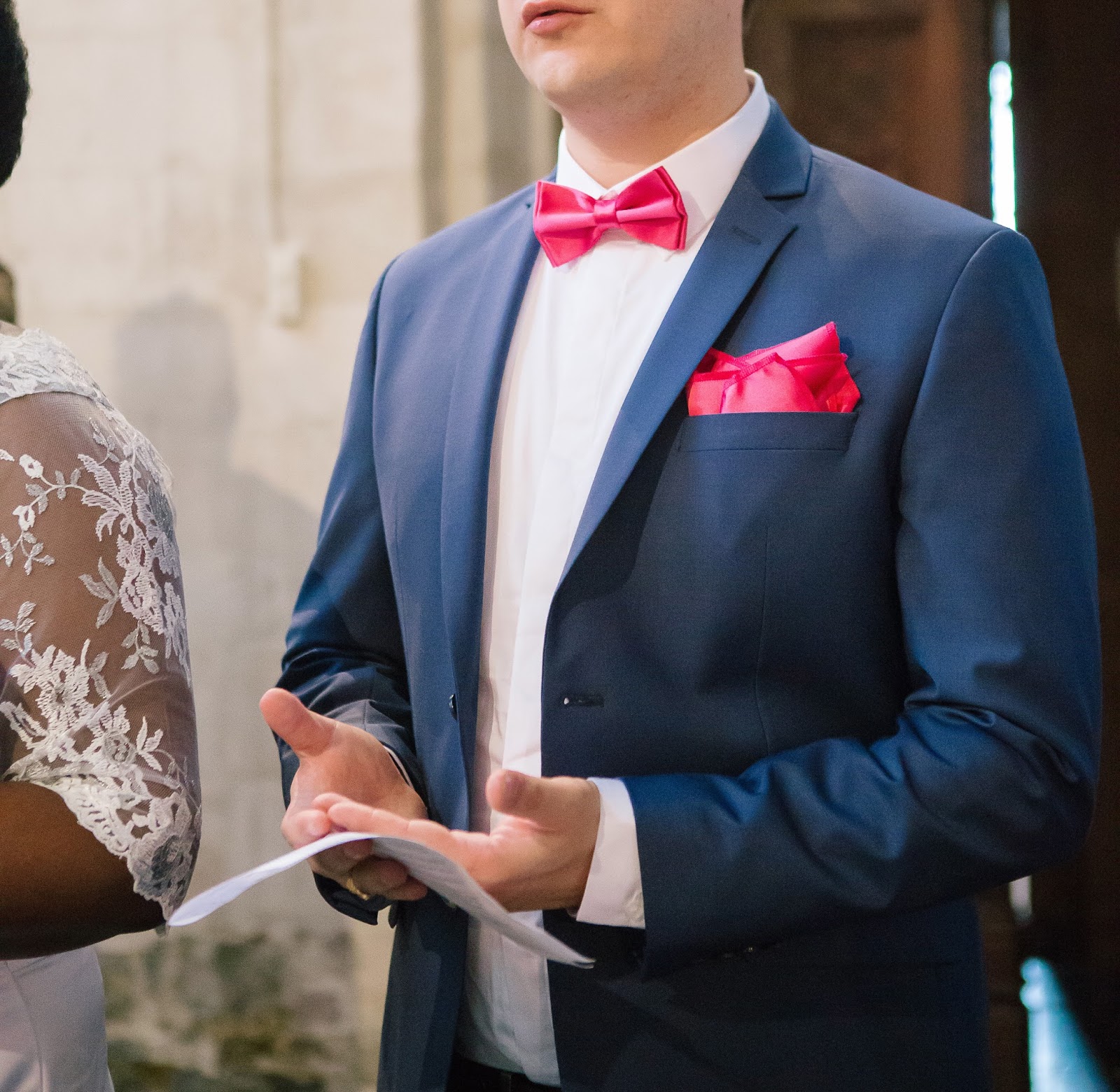 Il a tenu à prendre des accessoires différents pour la cérémonie civile et pour la religieuse. Pour l’église il a tenu à sa lavallière à tout prix. Je vous parlais du programme de la journée dans le billets dans lequel je vous présentais ma propre tenue ici.