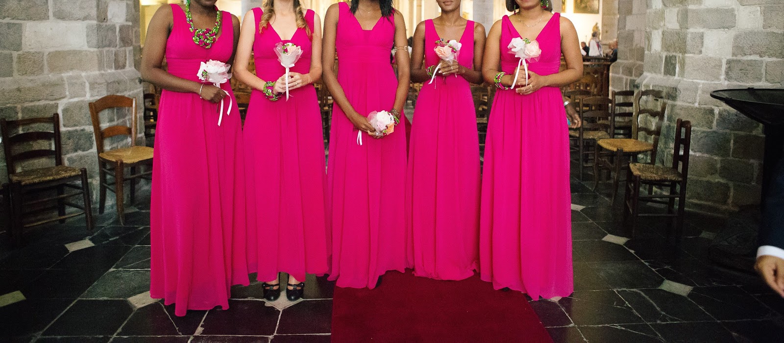 Mes (5) demoiselles d’honneur ont vraiment eu du mal à trouver la robe qui plairait à tout le monde et entrerait à la fois dans le budget de toutes. Je tenais absolument à ce qu’elles portent la même robe, à l’américaine. ça a été un sujet brûlant pendant des mois mais on a fini par se rabattre sur une jolie robe unie drapée, sur Amazon, très accessible. Basique mais qui a fait son effet. Elles devaient également choisir, comme mes témouïnes, des bijoux qu’Etoune Soleil leur a confectionné dans le tissu du mariage. Pour terminer leur tenue, elles ont eu droit à un petit bouquet de fleurs, les mêmes que les miennes.