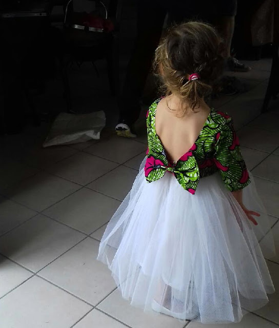 Et enfin, pour les petites demoiselles d’honneur, je n’ai pas hésité longtemps avant de craquer pour une roble Mademoiselle Blé avec du tulle en bas. Cela fait longtemps que je rêvasse devant les superbes créations en wax de cette créatrice, et à la vue de cette robe j’ai eu un énorme coup de coeur. Mademoiselle Blé est aussi talentueuse qu’efficace, les robes des petites princesses ont eu beaucoup de succès. Et ce décolleté dans le dos <3 <3 <3