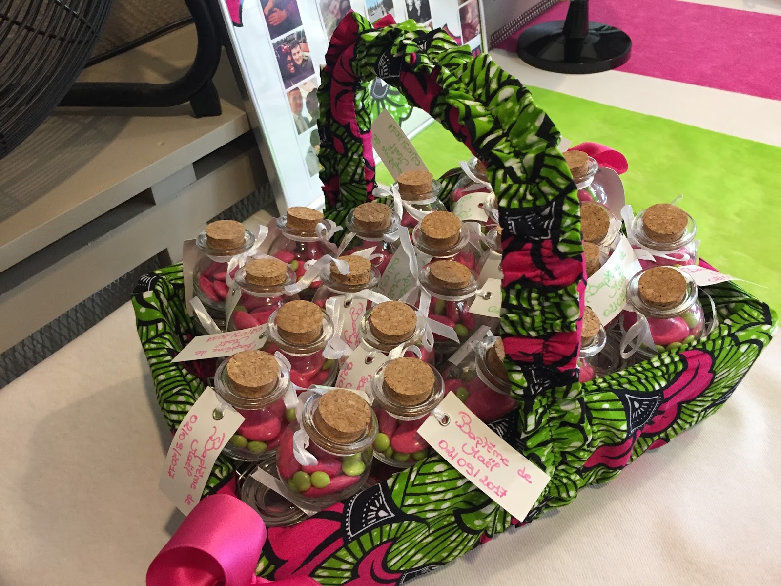 Le panier en osier a été customisé par ma belle-mère, d’après l’idée des décorations de paniers à dragées que les gens font couramment au Gabon et que j’ai donc souvent vues dans les mariages. Toujours avec le tissu qui était le fil conducteur de la décoration, avec le vert et le rose.