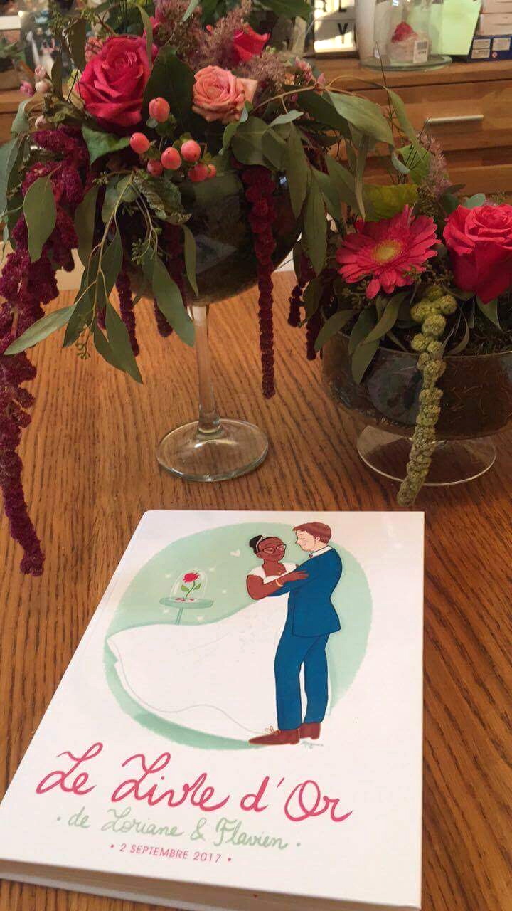 • Le petit bonus est en fait une surprise que j’avais réservée à Monsieur Dada: le livre d’or personnalisé. J’avais envie d’une illustration inédite et d’un clin d’oeil à la Belle et a Bête car notre ouverture de bal s’est faite sur Histoire éternelle. Livre gardé caché jusqu’au jour J car Morgane nous a représentés dans nos tenues-mêmes de mariage.